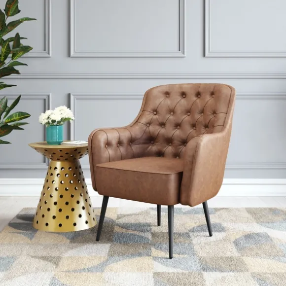 Add A Cozy New Seat To Your Home With This Brown Faux Leather Classic Accent Chair. Its Chic, Retro Style And Super Comfy Design Will Complete Any Space, From The Living Room To Your Home Office! Chair Measures 29.1L X 31.1W X 35.4H In.; Seat Measures 18.1H In.Crafted With A Steel And Wood Composite Frameblack Leg Finishupholstered In Brown, Leather-Like Polyesterfoam Filltufted Back Designweight Capacity: 330 Lbs.Some Assembly Requirednot Intended For Commercial Usecare: Spot Clean With Warm Water And Mild Soap.This Item Is Available At Kirklands.Com Only, Not Available In Stores. Please Note: This Item Cannot Be Shipped To Apo/Fpo Addresses.