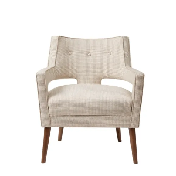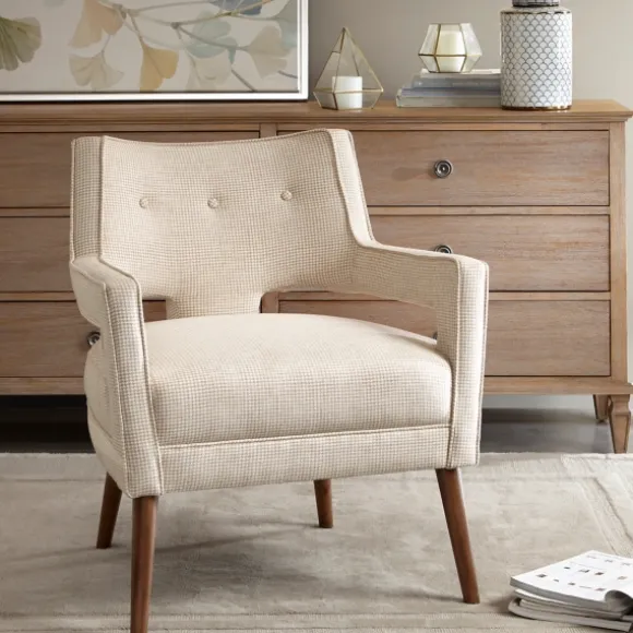Tapered Legs, Angular Design, And Open Back Accents Lend A Mid-Century Modern Twist To A Classic Armchair. The Soft Color Palette And Subtle Pattern Of Our Ivory Open Back Mid-Century Modern Nicoli Armchair Make It The Perfect Chair For Any Space.Chair Measures 29L X 28.3W X 33.3H In.; Seat Height: 19.5 In.Crafted With A Wood And Wood Composite Framehigh Density Foam Fill Cushionsupholstered In Cream Houndstooth Fabricpecan Solid Wood Finish Legsfeatures Button Tufted Back Detailingopen Back Designweight Limit: 300 Lbs.Some Assembly Requirednot Intended For Commercial Usecare: Spot Clean Only.This Item Is Available At Kirklands.Com Only, Not Available In Stores. Please Note: This Item Cannot Be Shipped To Apo/Fpo Addresses.