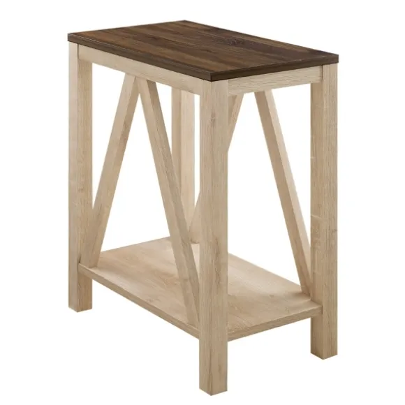Our Walnut And White Oak Narrow Frame Accent Table Features A Simple And Chic Design You’Ll Adore! This Farmhouse Table Will Look Wonderful In Your Space.Accent Table Measures 22L X 13W X 25H In. Crafted Of Warp-Resistant Wood Composite And Durable Laminate Dark Walnut Top Finish White Oak Frame Finish Features An A-Frame Design Accented With One (1) Bottom Shelf Weight: 25 Lbs. Full Assembly Required Not Intended For Commercial Use Care: Wipe Clean With A Damp Cloth. This Item Is Available At Kirklands.Com Only, Not Available In Stores. Please Note: This Item Cannot Be Shipped To Apo/Fpo Addresses. Warning:This Product Can Expose You To Chemicals Including Dust And Phthalates Which Is Known To The State Of California To Cause Cancer And Birth Defects Or Other Reproductive Harm. For More Information Go Towww.P65Warnings.Ca.Gov .