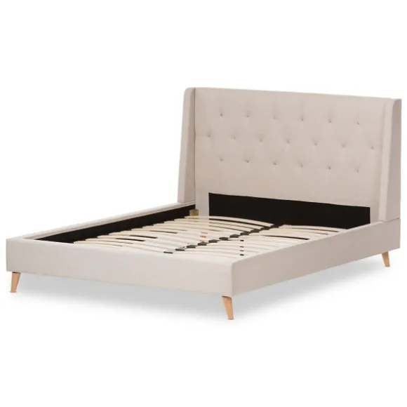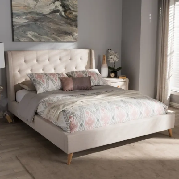 Bring Elegant Style Into Your Bedroom With This Beige Upholstered Wingback Queen Platform Bed. Its Button Tufted Design …