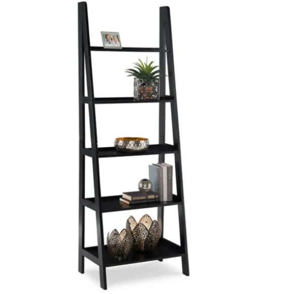 Organize All Your Books, Plants, And Decor With Modern Style! The Black Wood 5-Tier Ladder Bookshelf Features A Slim Pro…