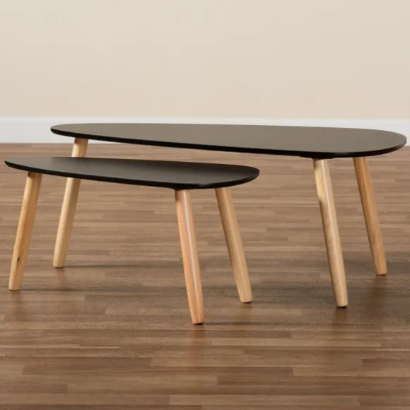 Complete The Lounge Space In Your Living Room With This Duo Of Black And Brown Wood Coffee Tables. With Their Softly Curved Shapes And Two Tone Finish, This Set Has A Distinctly Modern Look. Set Includes Two (2) Coffee Tableslarge Table Measures 39.4L X 15.7W X 19.7H In.Small Table Measures 27.6L X 13.8W X 13.8H In.Crafted Of Pine Woodtwo Tone Finishblack Tabletop Finishbrown Oak Finish On Legsangled Legscurved Tabletop Shapesweight: 16.8 Lbs.Assembly Requirednot Intended For Commercial Usecare: Dust With A Soft, Dry Cloth.This Item Is Available At Kirklands.Com Only, Not Available In Stores. Please Note: This Item Cannot Be Shipped To Apo/Fpo Addresses.