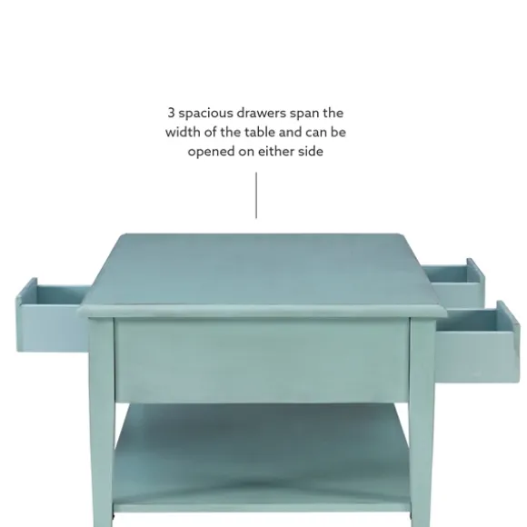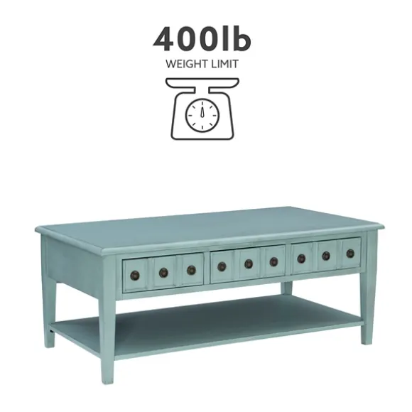 Complete Your Cozy Living Room Lounge Space With This Distressed Turquoise Wood 3-Drawer Coffee Table! This Charming Statement Piece Will Perfectly Fit In Any Rustic Setting. Table Measures 47.75L X 28W X 20H In.Crafted Of Wood Composite, Rubberwood, Hardwood, And Metaldistressed Turquoise Finishfeatures Three (3) Drawersaccented With An Open Bottom Shelfdetailed With Round Metal Drawer Pulls In An Antique Bronze Finishtabletop Weight Capacity: 400 Lbs.Shelf Weight Capacity: 100 Lbs.Drawer Weight Capacity: 10 Lbs. Eachassembly Requirednot Intended For Commercial Usecare: Dust With A Soft, Dry Cloth.This Item Is Available At Kirklands.Com Only, Not Available In Stores. Please Note: This Item Cannot Be Shipped To Apo/Fpo Addresses.Warning:This Product Can Expose You To Chemicals Including Dehp Which Is Known To The State Of California To Cause Cancer And Birth Defects Or Other Reproductive Harm.For More Information Go Towww.P65Warnings.Ca.Gov .