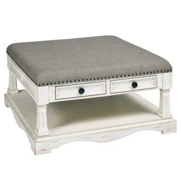 Add A Classically Cozy Look To Your Living Room With This Ivory And Gray Upholstered Square Coffee Table. Its Nail Head Trim And Rustic Accents Makes This Piece A Standout. You’Ll Love Propping Your Feet Up On This Stunning Table! Coffee Table Measures 38L X 38W X 19H In.Crafted Of Wood Composite, Fabric, Foam, Metal, And Woodchalk Ivory Wood Finishcarved Legs And Engraved Basefeatures Two (2) Drawers And One (1) Lower Tier For Storageantique Bronze Metal Hardwarelight Gray Upholsteryweight: 95 Lbs.Weight Capacity: 300 Lbs.Some Assembly Requirednot Intended For Commercial Usecare: Dust With A Soft, Dry Cloth.This Item Is Available At Kirklands.Com Only, Not Available In Stores. Please Note: This Item Cannot Be Shipped To Apo/Fpo Addresses.