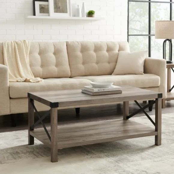 This Gray Wash Industrial X-Frame Coffee Table Would Look Great Sitting In Front Of Your Leather Couch! The Bottom Shelf Has Plenty Of Space For Three Wire Baskets That Provide Extra Storage And Add To The Industrial Look.Accent Table Measures 40L X 18W X 22H In. Crafted Of Laminate And Metal Gray Wash Finish Black Metal Finish Natural, Wood Grain Details Metal X-Shaped Design On Two (2) Sides Bracket Accents On Top Four (4) Corners Features One (1) Lower Shelf For Storage And Display Rectangle Shape Full Assembly Required Not Intended For Commercial Use Care: Dust With A Soft, Dry Cloth.This Item Is Available At Kirklands.Com Only, Not Available In Stores. Please Note: This Item Cannot Be Shipped To Apo/Fpo Addresses.