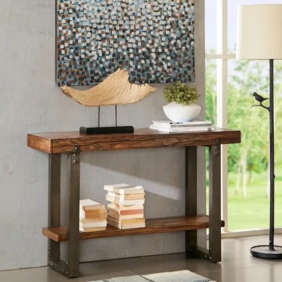 Add A Rustic Touch To Your Home With Our Lovely Distressed Brown Wood And Gunmetal Console Table. You’Ll Love The Shabby Chic Look Of The Mixed Materials. Coffee Table Measures 48L X 14W X 30H In.Crafted Of Wood Composite And Metalbrown Wood Finish And Gunmetal Leg Finishfeatures One (1) Lower Shelf For Storageweight: 45.76 Lbs.Weight Capacity: 85 Lbs.Assembly Requirednot Intended For Commercial Usecare: Dust With A Soft, Dry Cloth.This Item Is Available At Kirklands.Com Only, Not Available In Stores. Please Note: This Item Cannot Be Shipped To Apo/Fpo Addresses.