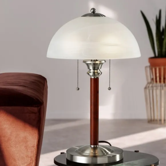 Add Some Illuminating Elegance To Your Space With Our Walnut Alabaster Frosted Glass Table Lamp. You’Ll Love The Polished And Classic Design Of This Table Lamp. Lamp Measures 22.5H In.Crafted Of Wood And Metalwalnut And Satin Steel Finishtapered Basefrosted Glass Dome Shadeshade Measures 6H X 13.5 In. In Diameter (At Widest)Socket Accommodates Two (2) 60-Watt Bulbsfeatures A Black, Plug-In Cord And On/Off Pull Chain Cordsmart Outlet Compatiblecare:Dust With A Soft, Dry Cloth. Do Not Exceed Specified Wattage.This Item Is Available At Kirklands.Com Only, Not Available In Stores. Please Note: This Item Cannot Be Shipped To Apo/Fpo Addresses.