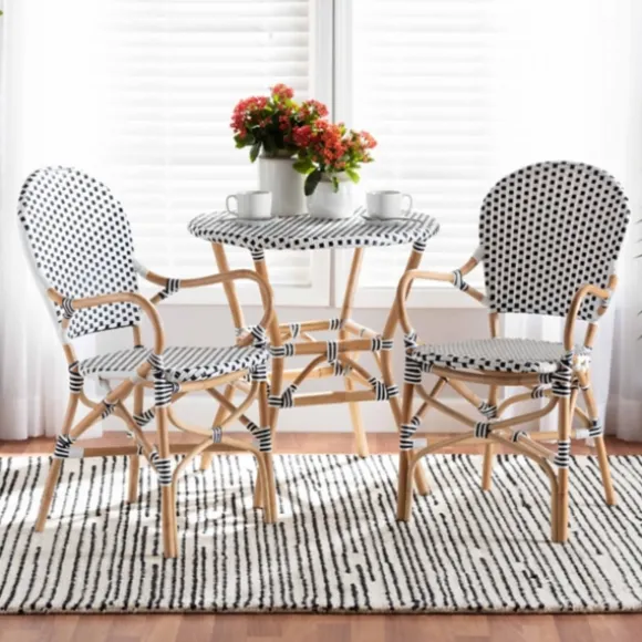 Inspired By French Bistros, These Black And White Woven Dining Chairs Will Bring A Chic Ambiance To Your Space. From Your Dining Room To Your Patio, This Set Will Bring Style And Charm To Any Area Of Your Home! Set Includes Two (2) Dining Chairseach Chair Measures 21.5L X 17.5W X 37.75H In.Crafted Of Rattan And Plasticnatural Frame Finishwrapped In Black And White Woven Plasticrounded Armrestsnot Intended For Commercial Usesafe For Indoor And Outdoor Usecare: Dust With A Soft, Dry Cloth.This Item Is Available At Kirklands.Com Only, Not Available In Stores. Please Note: This Item Cannot Be Shipped To Apo/Fpo Addresses.