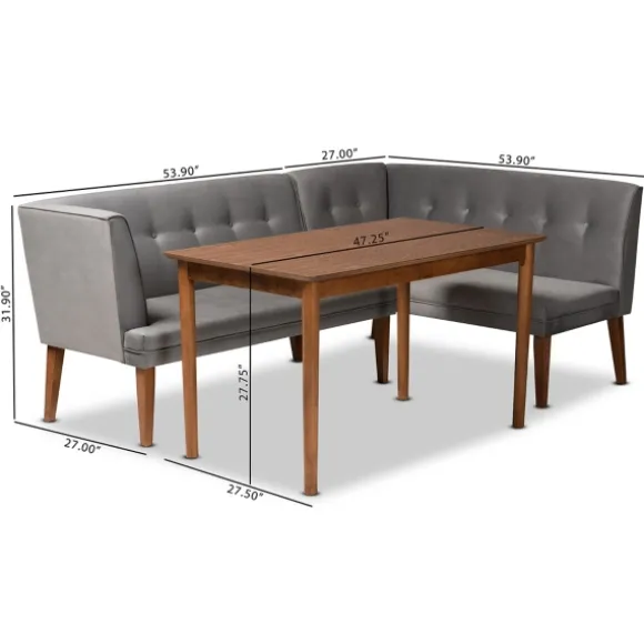 Make The Most Out Of Your Breakfast Nook! With Our Gray Velvet And Walnut Bench 4-Pc. Dining Set, You And Your Family Can Gather Around The Table In Even The Most Compact Of Spaces. Set Includes One (1) Dining Table, Two (2) 2-Seater Benches, And One (1) Corner Benchtable Measures 47.3L X 27.5W X 27.8H In.Each 2-Seater Bench Measures 53.9L X 27W X 31.9H In.Corner Bench Measures 27L X 27W X 31.9H In.Crafted Of Rubberwood And Wood Compositebenches Upholstered In 100% Polyester Velvetwalnut Wood Finish With Gray Upholsteryfeatures A Button-Tufted Designsome Assembly Requirednot Intended For Commercial Usecare: Wipe With A Soft, Damp Cloth. Not Safe For Outdoor Use.This Item Is Available At Kirklands.Com Only, Not Available In Stores. Please Note: This Item Cannot Be Shipped To Apo/Fpo Addresses.Warning:This Product Can Expose You To Chemicals Including Formaldehyde And Phthalate Which Are Known To The State Of California To Cause Cancer And Birth Defects Or Other Reproductive Harm.For More Information Go Towww.P65Warnings.Ca.Gov .