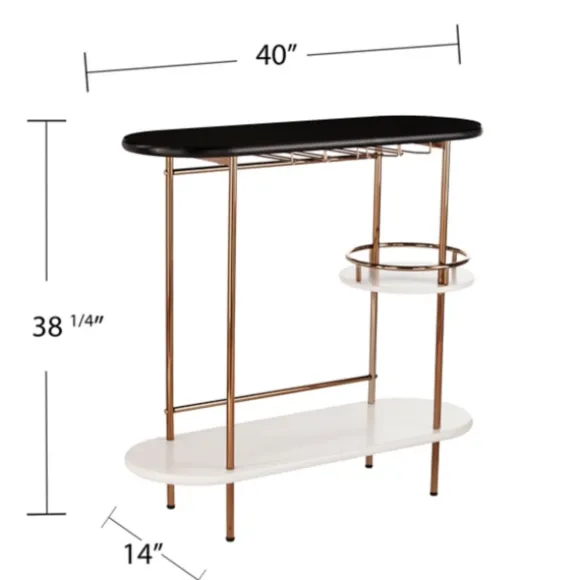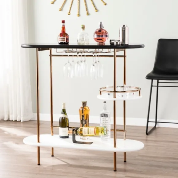 Create Your Very Own Home Bar With This Oblong Gold Metal Frame Bar Cart. With Its Ample Shelf Space And Stunning, Modern Design, It’S Perfect For Storing Spirits And Glassware! Plus, It Makes Serving Guests Easy And Stylish. Cart Measures 40L X 14W X 38.25H In.Crafted Of Metal And Woodgold Frame Finishblack Top Finishwhite Faux Marble Shelf Finishfeatures One (1) Lower Shelf, One (1) Middle Round Shelf, And Four (4) Glassware Racksassembly Requirednot Intended For Commercial Usecare: Dust With A Soft, Dry Cloth.This Item Is Available At Kirklands.Com Only, Not Available In Stores. Please Note: This Item Cannot Be Shipped To Apo/Fpo Addresses.Warning:This Product Can Expose You To Chemicals Including Lead, Which Is Known To The State Of California To Cause Cancer And Birth Defects Or Other Reproductive Harm.For More Information Go Towww.P65Warnings.Ca.Gov .