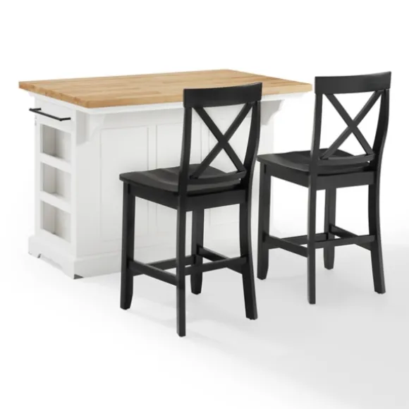 Revamp Your Kitchen With Traditional Style And Extra Storage Space Using This White And Black Wood 3-Pc. Kitchen Island Set. Whether It’S Used As A Cozy Breakfast Nook Or As Additional Counter Space, This Set Makes A Functional And Fashionable Presence In Any Home. Set Includes One (1) Kitchen Island And Two (2) Counter Stoolskitchen Island Measures 50L X 32W X 36H In.Each Counter Stoolmeasures 16L X 21.25W X 41H In.; Seat Measures 24H In.Crafted Of Woodwhite Kitchen Island Finishnatural Countertop Finishblack Counter Stool Finishx-Back Counter Stool Designfeatures Five (5) Storage Drawers And Two (2) Storage Cabinetsincludes A Built-In Spice Rack And Towel Rackaccented With Black Metal Hardwareisland Weight Capacity: 100 Lbs.Drawer Weight Capacity: 15 Lbs. Eachshelf Weight Capacity: 20 Lbs. Eachassembly Requirednot Intended For Commercial Usecare: Dust With A Soft, Dry Cloth. Spot Clean.This Item Is Available At Kirklands.Com Only, Not Available In Stores. Please Note: This Item Cannot Be Shipped To Apo/Fpo Addresses.Warning:This Product Can Expose You To Chemicals Including Wood Dust And Lead Which Is Known To The State Of California To Cause Cancer And Birth Defects Or Other Reproductive Harm.For More Information Go Towww.P65Warnings.Ca.Gov .