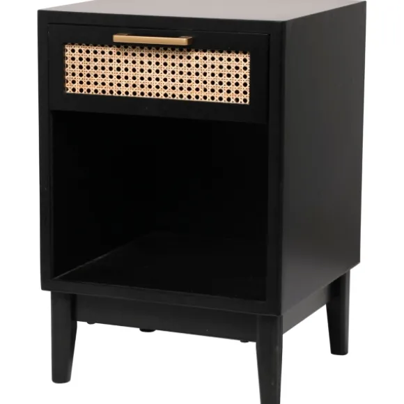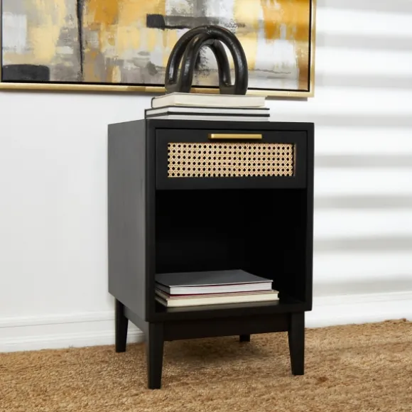 The Black Wood And Natural Rattan Drawer Nightstand Will Update Your Bedroom With Modern-Boho Charm. The Open Shelving Is Perfect For Displaying Books, Decor, And Bedtime Essentials. Nightstand Measures 17.9L X 17.7W X 26.35H In.Crafted With A Wood Composite Frameblack Finishnatural Rattan Drawer Frontfeatures One (1) Drawer And Open Shelvingaccented With Gold Metal Drawer Pullweight Capacity: 100 Lbs.No Assembly Requirednot Intended For Commercial Usecare: Dust With A Soft, Dry Cloth.This Item Is Available At Kirklands.Com Only, Not Available In Stores. Please Note: This Item Cannot Be Shipped To Apo/Fpo Addresses.Warning:Cancer And Reproductive Harm – For More Information Go Towww.P65Warnings.Ca.Gov .