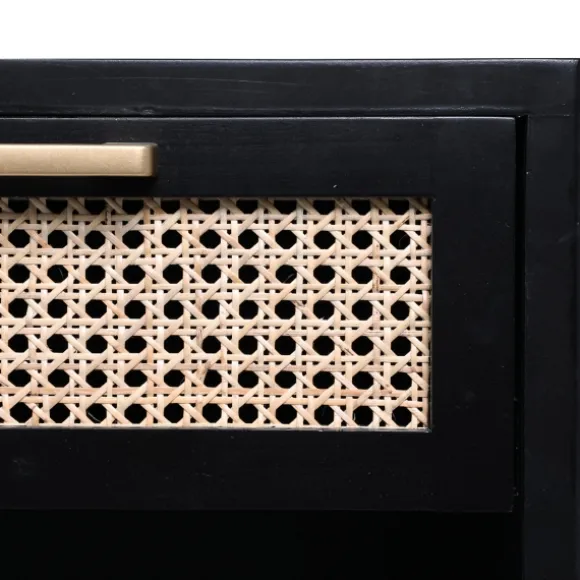 The Black Wood And Natural Rattan Drawer Nightstand Will Update Your Bedroom With Modern-Boho Charm. The Open Shelving I…