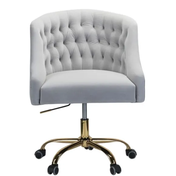 Makeover Your Home Office With Our Stunning Gray Velvet Tufted Golden Leg Swivel Office Chair. You’Ll Love The Luxurious Look Of This Upholstered Swivel Chair. Chair Measures 26L X 24.5W X 32.5H In.; Seat Measures 19-22H In. Crafted Of Metal Golden Metal Leg Finish Upholstered In Gray Velvet Fabric Features Barrel Shape Design And Tufted Detailing Features Swivel Design And Adjustable Height Features High Performance All Directional Wheels For Easy Movement Weight: 29.76 Lbs. Weight Capacity: 220 Lbs. Assembly Required Not Intended For Commercial Use Care: Spot Clean Only.This Item Is Available At Kirklands.Com Only, Not Available In Stores. Please Note: This Item Cannot Be Shipped To Apo/Fpo Addresses.