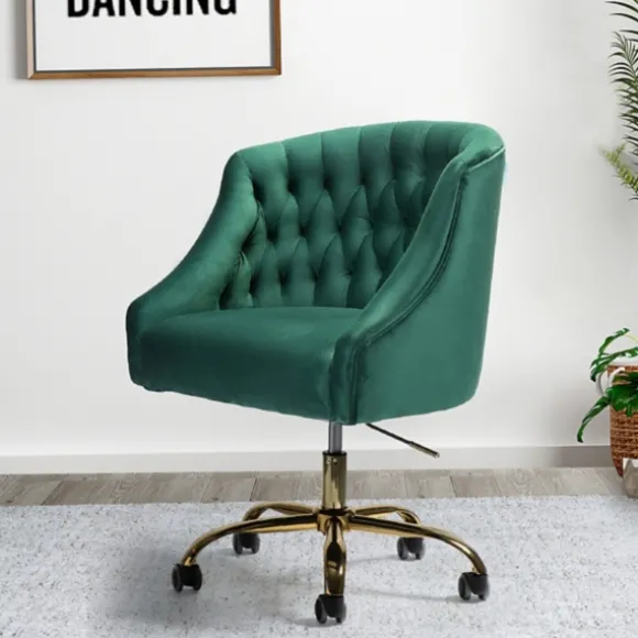 Makeover Your Home Office With Our Stunning Green Velvet Tufted Golden Leg Swivel Office Chair. You’Ll Love The Luxurious Look Of This Upholstered Swivel Chair. Chair Measures 26L X 24.5W X 32.5H In.; Seat Measures 19-22H In. Crafted Of Metal Golden Metal Leg Finish Upholstered In Green Velvet Fabric Features Barrel Shape Design And Tufted Detailing Features Swivel Design And Adjustable Height Features High Performance All Directional Wheels For Easy Movement Weight: 29.76 Lbs. Weight Capacity: 220 Lbs. Assembly Required Not Intended For Commercial Use Care: Spot Clean Only.This Item Is Available At Kirklands.Com Only, Not Available In Stores. Please Note: This Item Cannot Be Shipped To Apo/Fpo Addresses.