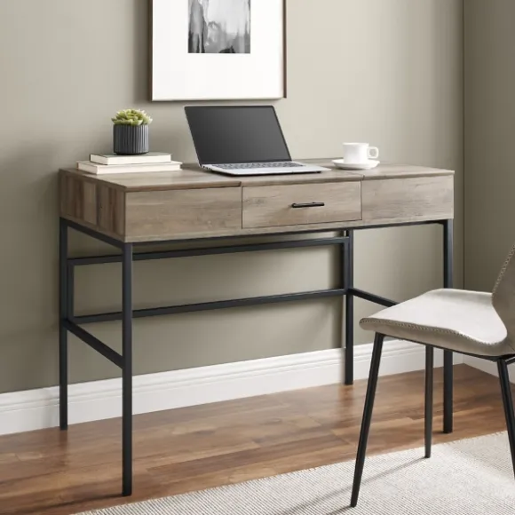 Turn Work Into Play With This Gray Washed Lift Top Storage Desk. While This Piece Features A Simple Silhouette, Its Capabilities Are Anything But. Tech-Savvy Creators’ And Literary Architects’ Dreams Unite With This Piece’S Built-In Metal Tray To Accommodate Tablets, Phones, And Novels For Maximum Productivity. Execute Projects With Ease And Keep Your Workspace In Sleek, Tip-Top Shape With Discreet Storage Within The Unique, Lift-Top Cubbies. A Single Drawer Houses Additional Office Supplies And Work-From-Home Essentials. Aesthetically Minimal And Pleasingly Utilitarian, This Desk Practically Puts In The Work For You. Desk Measures 42L X 22.5W X 31H In.Crafted Of Wood Composite, Laminate, And Powder-Coated Steelgray Washed Finishblack Metal Base Finishlift-Top Design Reveals Hidden Storage Cubbiessingle Drawerflip-Up Metal Tray Holds Phones, Tablets, Or Booksweight Capacity: 100 Lbs.Assembly Requirednot Intended For Commercial Usecare: Dust With A Soft, Dry Cloth.This Item Is Available At Kirklands.Com Only, Not Available In Stores. Please Note: This Item Cannot Be Shipped To Apo/Fpo Addresses.Warning:This Product Can Expose You To Chemicals Including Dust And Phthalates Which Is Known To The State Of California To Cause Cancer And Birth Defects Or Other Reproductive Harm.For More Information Go Towww.P65Warnings.Ca.Gov .