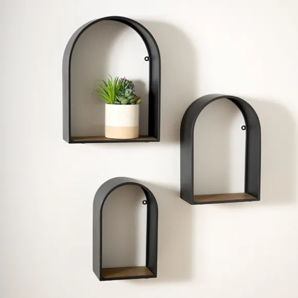 These Black Metal Arch Shelves Are Ideal For Displaying Photos, Plants, And Trinkets. With A Simple, Modern Design, They’Ll Make A Great Addition To Any Wall! Set Includes Three (3) Shelveslarge Shelf Measures 12.5L X 5W X 16.75H In.Medium Shelf Measures 10.4L X 5W X 15.25H In.Small Shelf Measures 8.1L X 5W X 13.5H In.Crafted Of Metalblack Finishbrown Wood Grain Shelf Top Finisharched Designweight: 6.39 Lbs.Weight Capacity: 11 Lbs.Hangs From Back-Mounted Hardwarecare: Dust With A Soft, Dry Cloth.Contact Your Local Kirkland’S Store For Availability. Quantities And Selection May Vary By Location.
