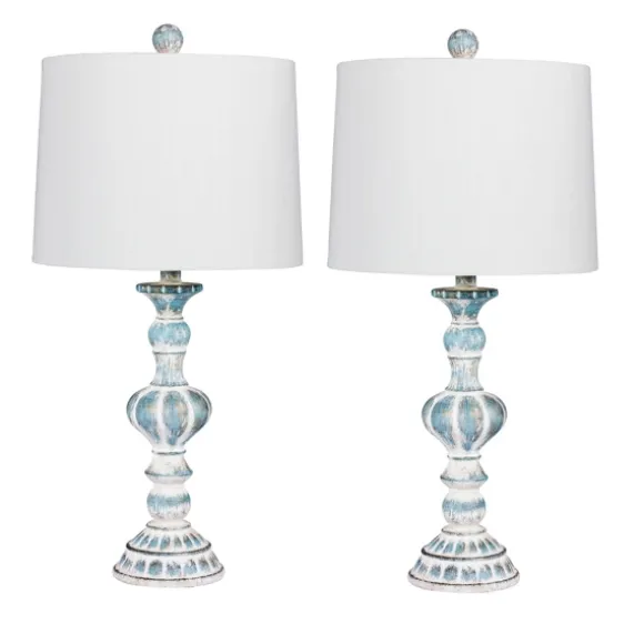 Give Your Decor A New Touch Of Rustic Style With These Antique Blue Candlestick Table Lamps. The Distressed Finish Gives Its Candlestick Shape A Farmhouse Appeal.Set Includes Two (2) Lamps Each Lamp Measures 26.5H In. Crafted Of Resin Antique Distressed Blue Finish Cottage Candlestick Base Hardback Drum Shade In White Fabric Shades Measures 9.5H X 13 In. In Diameter Sockets Accommodates A 100-Watt Bulb Features An 5 Ft. Long, Plug-In Cord Care:Dust With A Soft, Dry Cloth. Do Not Exceed Specified Wattage.This Item Is Available At Kirklands.Com Only, Not Available In Stores. Please Note: This Item Cannot Be Shipped To Apo/Fpo Addresses.