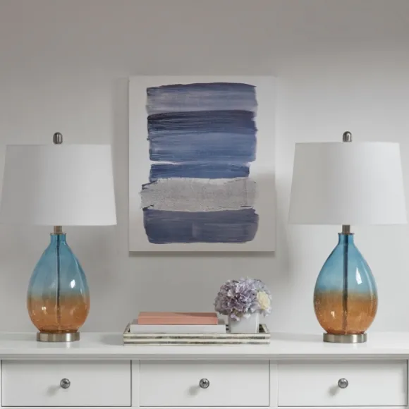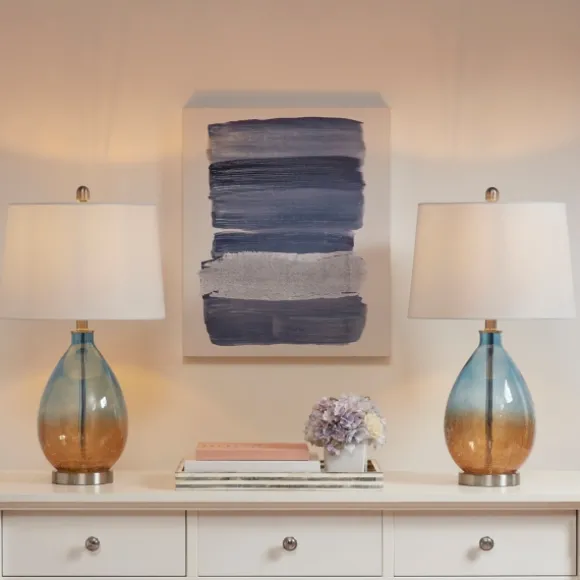 Nothing Makes A House Feel More Like A Home Than The Warm, Inviting Glow Of A Stunning Lamp. Illuminate Your Space With Our Beautiful Set Of Blue And Amber Glass Table Lamps. Set Includes Two (2) Table Lampseach Lamp Measures 26H In.Crafted Of Glassblue And Amber Base Finishteardrop Shape Basehardback Tapered Drum Shade In White Fabricshade Measures 15L X 13W X 10H In.Each Socket Accommodates One (1) Type-A, 60-Watt Bulbfeatures A 72 In. Clear, Plug-In Cord And On/Off Rotary Switch On Socketcare:Dust With A Soft, Dry Cloth. Do Not Exceed Specified Wattage.This Item Is Available At Kirklands.Com Only, Not Available In Stores. Please Note: This Item Cannot Be Shipped To Apo/Fpo Addresses.