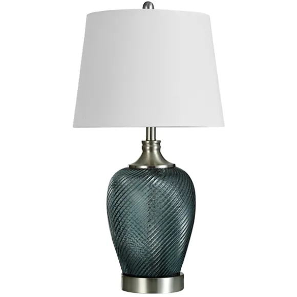 Light Up Your Home In An Elegant Way With This Dark Aqua Ribbed Swirl Table Lamp! The Transluscent Tint And Textured Design Are Perfect For Your Entryway Table. Lamp Measures 29H In.Crafted Of Glass And Metaldark Aqua Tint With Brushed Steel Accentsfeatures A Ribbed Swirl Designhardback Tapered Shade In Whiteshade Measures 11H X 15 In. In Diametersocket Accommodates A 150-Watt Incandescent Bulb3-Way Switchfeatures A Clear, 62-In. Plug-In Corddue To The Production Process, Each Lamp Will Have A Different Finish And Unique Overall Design.Care: Dust With A Soft, Dry Cloth. Do Not Exceed Specified Wattage.This Item Is Available At Kirklands.Com Only, Not Available In Stores. Please Note: This Item Cannot Be Shipped To Apo/Fpo Addresses.