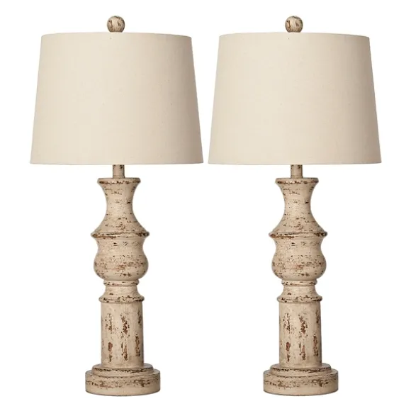 Our Distressed Cream Table Lamps Feature Effortless Rustic Style. These Matching Lamps Are Perfect For Flanking Your Bed And Bringing Farmhouse Flair To Your Bedroom.Set Includes Two (2) Lampseach Lamp Measures 32H In.Crafted Of Polyresindistressed Cream Finishcandlestick Style Basehardback Round Shades In Cream Fabriceach Shade Measures 10.5H X 15 In. In Diametersockets Accommodate One Three-Way, 100-Watt Bulbfeatures A 60 In. Brown, Plug-In Cordcare: Dust With A Soft, Dry Cloth. Do Not Exceed Specified Wattage.Contact Your Local Kirkland’S Store For Availability. Quantities And Selection May Vary By Location.