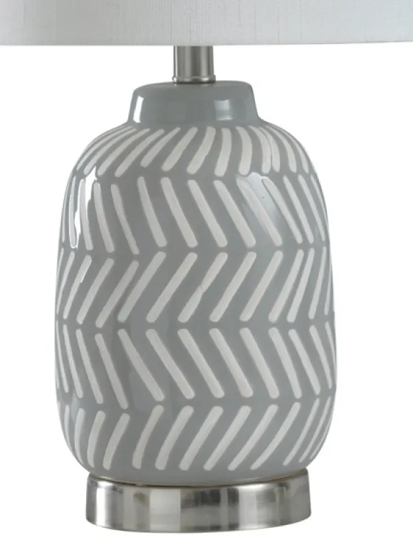 Add A Touch Of Global Texture To Your Home With This Gray And White Etched Table Lamp! You’Ll Love How Its Etched Pattern Adds Dimension To Your Decor.Lamp Measures 23.25H In.Crafted Of Ceramic And Metalgray And White Finishrounded Base With Etched Patternhardback Round Shade In White Fabricshade Measures 9.5H X 12.5 In. In Diametersocket Accommodates A 60-Watt Bulbfeatures A Clear, Plug-In Cordcare:Dust With A Soft, Dry Cloth. Do Not Exceed Specified Wattage.This Item Is Available At Kirklands.Com Only, Not Available In Stores. Please Note: This Item Cannot Be Shipped To Apo/Fpo Addresses.