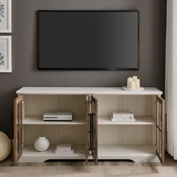 You’Ll Love The Farmhouse Windowpaned Glass Doors Of Our White And Rustic Oak Glass Door Tv Stand. The Mixture Of Wood And Metal Look Incredible On This Piece.Media Stand Measures 58L X 16W X 28H In. Crafted Of Warp-Resistant Wood Composite, Durable Laminate, Metal, And Tempered Glass Brushed White Frame Finish Rustic Oak Doors Features Four (4) Farmhouse Windowpaned Glass Doors That Reveal Two (2) Adjustable Shelves Antiqued Metal Hardware And Accents Weight Capacity: 250 Lbs. Fits Tv Sizes Up To 65 In.Full Assembly Required Not Intended For Commercial Use Care: Dust With A Soft, Dry Cloth. This Item Is Available At Kirklands.Com Only, Not Available In Stores. Please Note: This Item Cannot Be Shipped To Apo/Fpo Addresses.