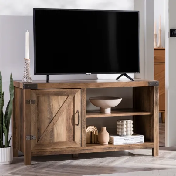 This Barn Door Rustic Oak Tv Stand With Open Shelves Balances Style And Function Effortlessly, Providing Needed Organization And An Antique Feel. You’Ll Have Plenty Of Space For Games, Movies, And Cable Boxes. Its Warm Finish Is Sure To Enrich Your Space!Stand Measures 44L X 16W X 24H In. Crafted With Laminate, Metal, And Warp-Resistant Wood Composite Rustic Oak Wood Finish Rectangular Design Features Two (2) Open Shelves And One (1) Barn Door Industrial Metal Pull Handle And Hinge Accents Has Adjustable Shelves And Can Fit Up To A 50-Inch Tv Fits Tv Sizes Up To 50 In.Full Assembly Required Not Intended For Commercial Use Care: Dust With A Soft, Dry Cloth.This Item Is Available At Kirklands.Com Only, Not Available In Stores. Please Note: This Item Cannot Be Shipped To Apo/Fpo Addresses.