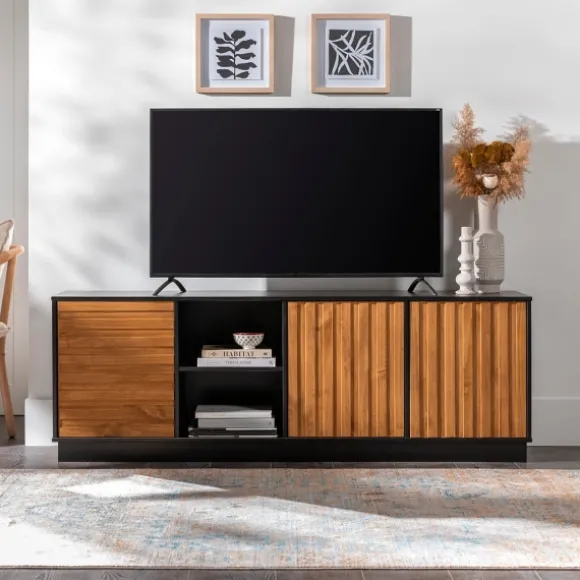 Don’T Be Surprised If You Catch Yourself Spending More Time Look At This Beautiful Stand Than At The Screen! The Carmel Wood Grooved Doors Tv Stand Has The Style And Space You Have Been Looking For. Stand Measures 70L X 16W X 26H In.Crafted Of Woodblack And Brown Wood Finishgrooved Door Designtwo (2) Shelvesassembly Requirednot Intended For Commercial Usecare: Dust With A Soft, Dry Cloth.This Item Is Available At Kirklands.Com Only, Not Available In Stores. Please Note: This Item Cannot Be Shipped To Apo/Fpo Addresses.Warning:This Product Can Expose You To Chemicals Including Dust And Phthalates Which Is Known To The State Of California To Cause Cancer And Birth Defects Or Other Reproductive Harm.For More Information Go Towww.P65Warnings.Ca.Gov .