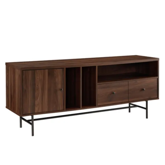 Organize And Display Your Items In Style With Our Stunning Dark Walnut Modern Record Storage Tv Stand. You’Ll Love The Sleek Design And Plethora Of Storage Spots This Cabinet Gives You. Stand Measures 60L X 15.5W X 25H In. Crafted Of Durable Laminate, Powder-Coated Metal, And Warp-Resistant Wood Composite Walnut Finish Features Two (2) Drawers And One (1) Door Features One (1) Horizontal Open Storage Compartment And Two (2) Vertical Open Storage Compartments Accommodates Up To A 65 In. Tv Weight: 81 Lbs. Full Assembly Required Not Intended For Commercial Use Care: Dust With A Soft, Dry Cloth.This Item Is Available At Kirklands.Com Only, Not Available In Stores. Please Note: This Item Cannot Be Shipped To Apo/Fpo Addresses. Warning:Cancer And Reproductive Harm – For More Information Go Towww.P65Warnings.Ca.Gov .
