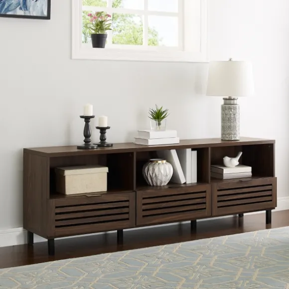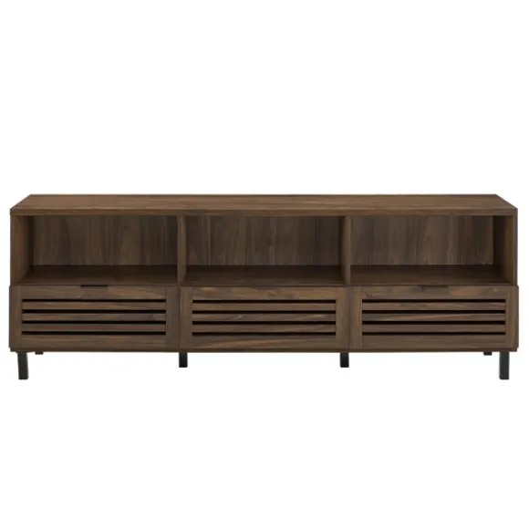 Our Dark Walnut Rustic Slat Door Tv Stand Will Give Your Living Space A Trendy, Contemporary Look. You’Ll Love Its Sleek Design And Slat Door Accents! It’S The Perfect Way To Organize Your Cords And Media Equipment.Stand Measures 70L X 15W X 24H In. Crafted With Laminate, Metal, And Warp-Resistant Wood Composite Dark Walnut Frame Finish Features Three (3) Sectioned Open Shelves For Storage Has Three (3) Lower Drawers Doors Have Open Horizontal Slatted Look Slim Legs Design Fits Tv Sizes Up To 85 In.Full Assembly Required Not Intended For Commercial Use Care: Dust With A Soft, Dry Cloth.This Item Is Available At Kirklands.Com Only, Not Available In Stores. Please Note: This Item Cannot Be Shipped To Apo/Fpo Addresses.