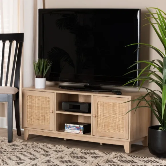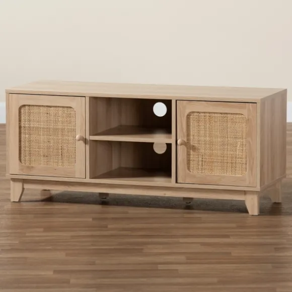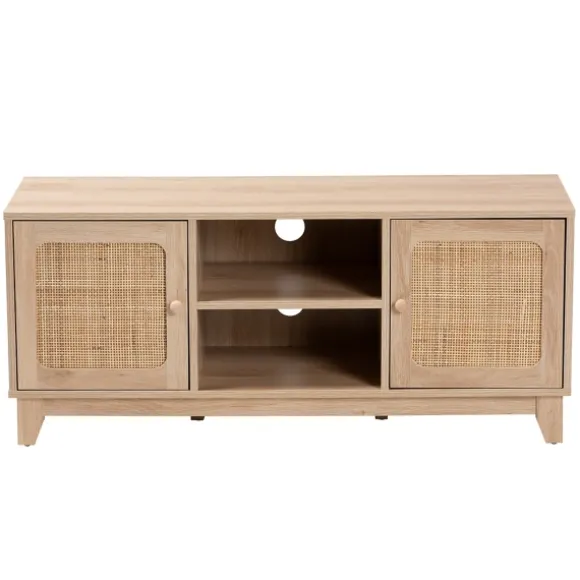 Tie Your Modern-Boho Living Room Together With This Light Brown Wood And Cane Accent Tv Stand! Featuring A Natural Wood Grain Finish And Woven Door Fronts, This Beautiful Piece Takes Inspiration From Mid-Century Modern Design. Tv Stand Measures 43.3L X 15W X 18.5H In.Crafted Of Engineered Wood And Rattanlight Brown Finishwoven Rattan Door Frontsfeatures Two (2) Open Shelves And Two (2) Doors That Reveal Storage Spaceaccommodates Televisions Measuring Up To 46 Inches (Measured Diagonally)Includes Two (2) Cord Management Holesassembly Requirednot Intended For Commercial Usecare: Dust With A Soft, Dry Cloth.This Item Is Available At Kirklands.Com Only, Not Available In Stores. Please Note: This Item Cannot Be Shipped To Apo/Fpo Addresses.Warning:This Product Can Expose You To Chemicals Including Formaldehyde And Phthalate Which Is Known To The State Of California To Cause Cancer And Birth Defects Or Other Reproductive Harm.For More Information Go Towww.P65Warnings.Ca.Gov .