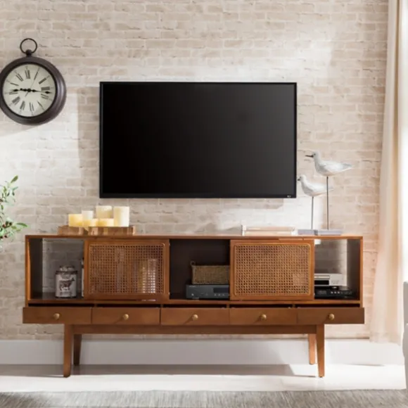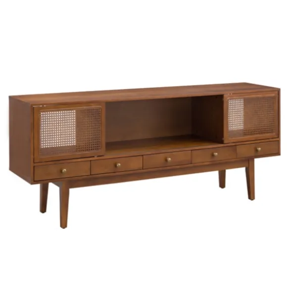 Add Some Timeless Charm To Your Family Room! Our Martina Midcentury Woven Cane Media Cabinet Features Plenty Of Space To Store Books, Game Consoles, And Decor. Plus, You’Ll Love Placing Your Televistion Or Record Player On The Top! Cabinet Measures 70L X 17W X 29.8H In.Crafted Of Wood And Faux Woven Canewarm Brown Finish With Gold Hardwareaccented With Gliding Rattan Doorsincludes Three (3) Storage Compartments And Five (5) Drawersaccomodates Tv Sizes Up To 68 In.Back Includes Open Sections For Cable Managementweight Capacity: 85 Lbs.Assembly Requirednot Intended For Commercial Usecare: Wipe With Soft, Damp Cloth.This Item Is Available At Kirklands.Com Only, Not Available In Stores. Please Note: This Item Cannot Be Shipped To Apo/Fpo Addresses.Warning:This Product Can Expose You To Chemicals Including Lead Which Is Known To The State Of California To Cause Cancer And Birth Defects Or Other Reproductive Harm.For More Information Go Towww.P65Warnings.Ca.Gov .