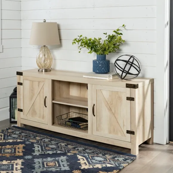 Our White Oak Barn Doors Tv Stand Features A Subtle Rustic Flair You’Ll Love! This Understated Piece Is Perfect For Stylishly Storing Your Movies And Games. It’S An Easy Way To Achieve A Relaxed Farmhouse Look.Stand Measures 58L X 16W X 24H In. Crafted Of Warp-Resistant Wood Composite And Durable Laminate White Oak Finish Barn Door Design Features Two (2) Doors, Three (3) Fixed Shelves And Three (3) Adjustable Shelves Bronze Handle And Hinge Hardware Features Three (3) Cord Control Cutouts Weight Capacity: 250 Lbs. Fits Tv Sizes Up To 65 In.Full Assembly Required Not Intended For Commercial Use Care: Dust With A Soft, Dry Cloth.This Item Is Available At Kirklands.Com Only, Not Available In Stores. Please Note: This Item Cannot Be Shipped To Apo/Fpo Addresses.