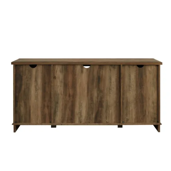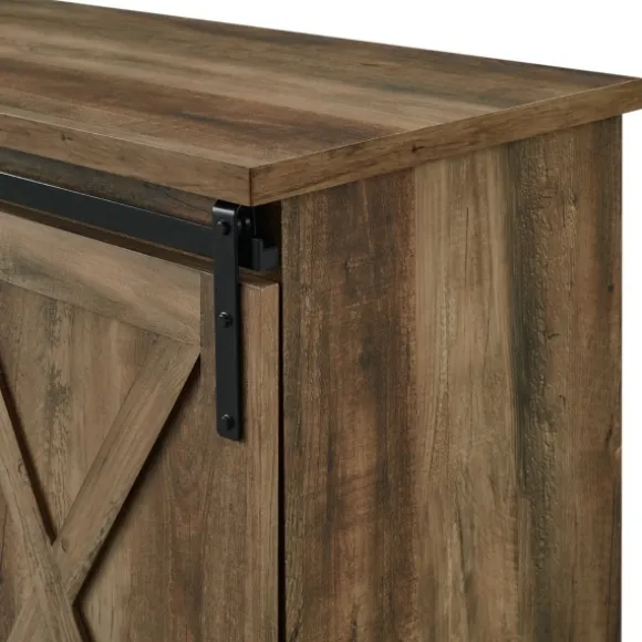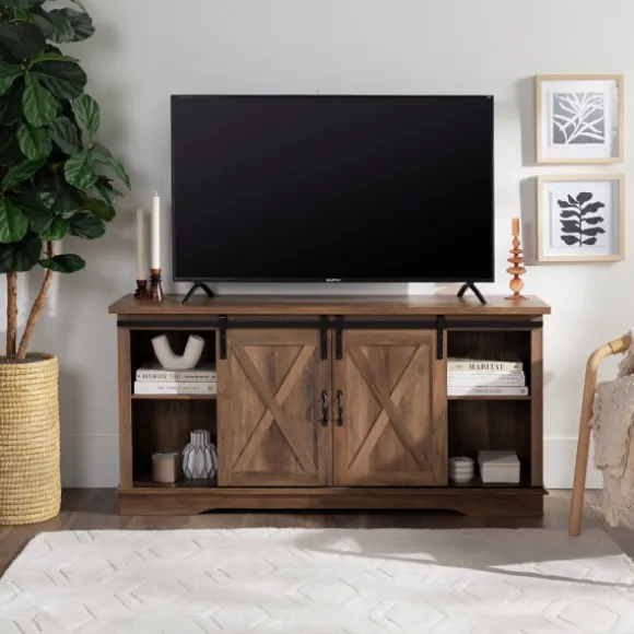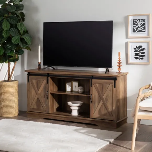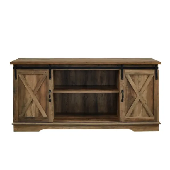 This Sliding Barn Door Open Shelf Oak Tv Stand Will Give Your Living Room A Chic And Charming Feel, While Also Providing Plenty Of Storage Space For Your Electronics And Decor. It Features Two Sliding Barn Door Cabinet Fronts For A Versatile Design. You Can Either Close Off The Middle Or Both Sides, Depending On Your Needs. Adjustable Shelving And Cable Management Make It Simple For You To Keep Your Electronics In One Place. This Media Console Is Constructed Of Warp-Resistant Mdf. The Modern Farmhouse Style Of This Entertainment Center Will Become A Piece Of Your Living Room That You’Ll Admire!Stand Measures 58L X 16W X 28H In.Crafted Of Durable Wood Composite With Laminate And Metalrustic Oak Wood Finishfeatures One (1) Open Shelf, Two (2) Sliding Doors, And Two (2) Shelves For Storagedrawer Fronts Feature Rolling Barn Door Designblack Metal Rollers And Handleshas Back Cord Management And Can Hold Up To A 65-Inch Tvfull Assembly Requirednot Intended For Commercial Usecare: Dust With A Soft, Dry Cloth.This Item Is Available At Kirklands.Com Only, Not Available In Stores. Please Note: This Item Cannot Be Shipped To Apo/Fpo Addresses.