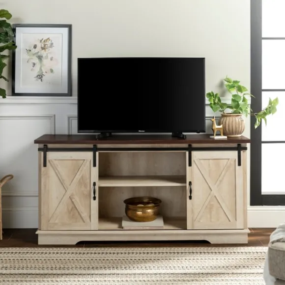 This Sliding Barn Door Open Shelf White Tv Stand’S Distressed Finishes And Industrial Style Will Give Your Living Room An Instant Vintage Makeover. It’S The Perfect Way To Achieve A Truly Rustic Feel!Stand Measures 58L X 16W X 28H In. Crafted Of Durable Wood Composite With Laminate And Metal White Wood Frame Finish With Natural Top Finish Features One (1) Open Shelf, Two (2) Sliding Doors, And Two (2) Shelves For Storage Drawer Fronts Feature Rolling Barn Door Design Black Metal Rollers And Handles Has Back Cord Management And Can Hold Up To A 65-Inch Tv Full Assembly Required Not Intended For Commercial Use Care: Dust With A Soft, Dry Cloth.This Item Is Available At Kirklands.Com Only, Not Available In Stores. Please Note: This Item Cannot Be Shipped To Apo/Fpo Addresses.