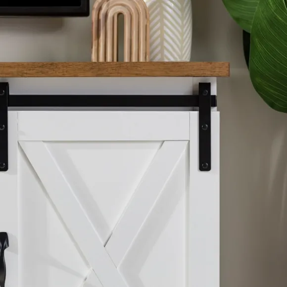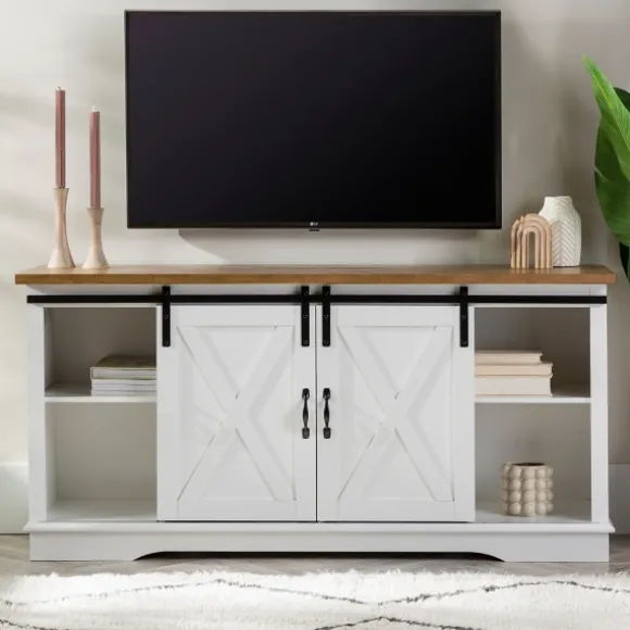 This White Sliding Door Rustic Oak Top Tv Stand’S Distressed Finishes And Industrial Style Will Give Your Living Room An Instant Vintage Makeover. It’S The Perfect Way To Achieve A Truly Rustic Feel!Stand Measures 58L X 16W X 28H In. Crafted Of Warp-Resistant Wood Composite, Durable Laminate, And Metal White Wood Finish Rustic Oak Wood Top Finish Features One (1) Open Shelf, Two (2) Sliding Doors, And Shelves For Storage Door Fronts Feature Rolling Barn Door Design Black Metal Rollers And Handles Has Back Cord Management And Can Hold Up To A 65-Inch Tv Full Assembly Required Not Intended For Commercial Use Care: Dust With A Soft, Dry Cloth.This Item Is Available At Kirklands.Com Only, Not Available In Stores. Please Note: This Item Cannot Be Shipped To Apo/Fpo Addresses.