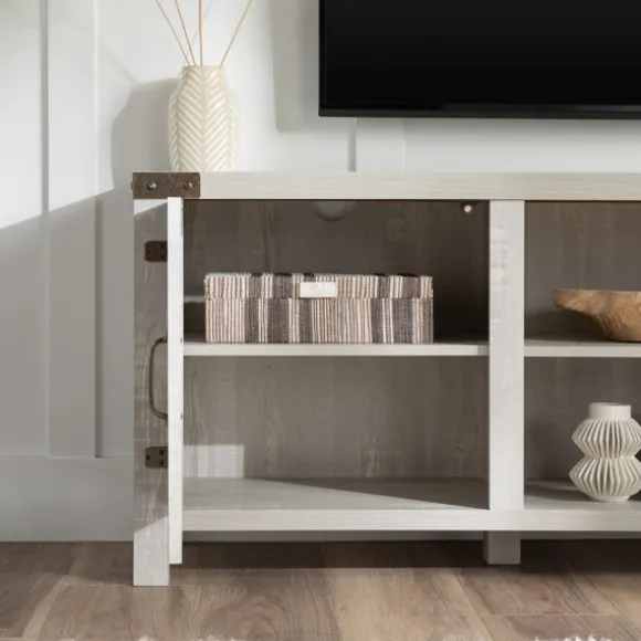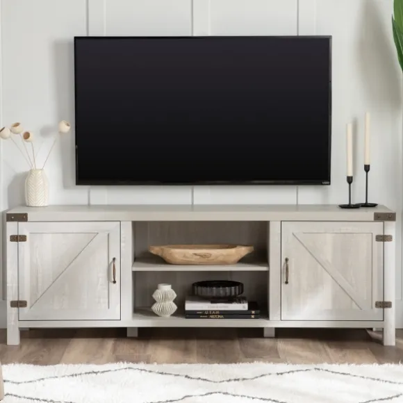 This Stone Gray Barn Door Tv Stand Balances Style And Function Effortlessly, Providing Needed Organization. You’Ll Have …