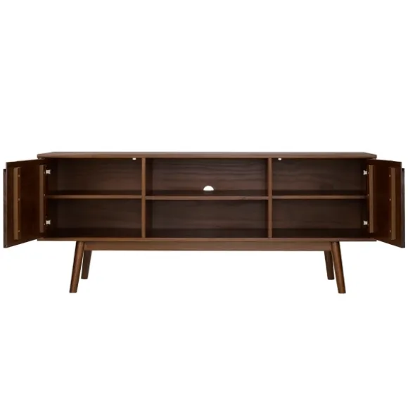 This Piece Is Sturdy Enough For A Large Tv Or Console And Stylish Enough To Complement Any Home’S Style. The Walnut Solid Wood Tv Console Is The Perfect Tv Accessory. Console Measures 58L X 16W X 24H In. Crafted Of Solid Pine Wood And Varnish Dark Wood Finish Mid-Century Modern Design Two (2) Doors With Soft-Close Hinges Fits Tv Sizes Up To 65 In.Full Assembly Required Not Intended For Commercial Use Care: Dust With A Soft, Dry Cloth.This Item Is Available At Kirklands.Com Only, Not Available In Stores. Please Note: This Item Cannot Be Shipped To Apo/Fpo Addresses. Warning:Cancer And Reproductive Harm – For More Information Go Towww.P65Warnings.Ca.Gov . For More Information Go Towww.P65Warnings.Ca.Gov .