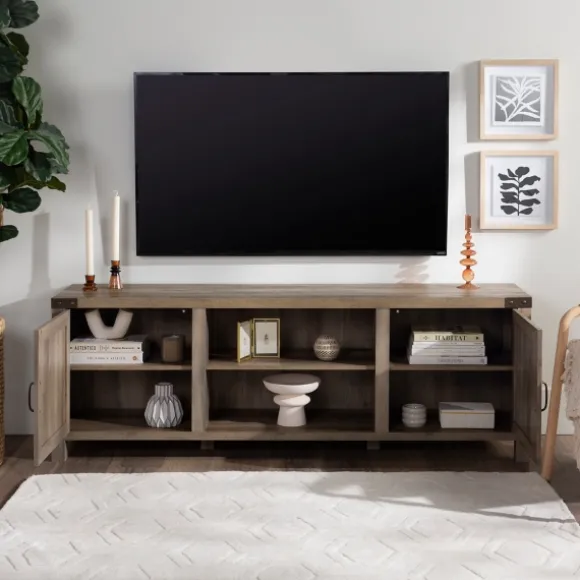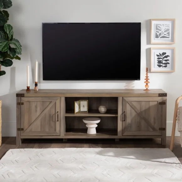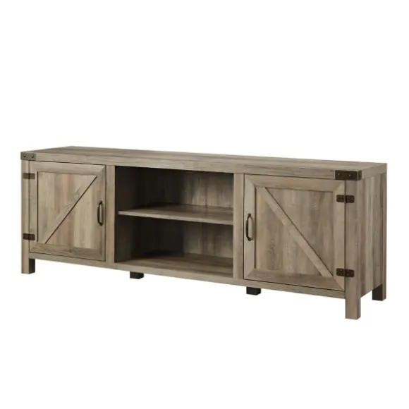This Gray Wash Barn Door Tv Stand Balances Style And Function Effortlessly, Providing Needed Organization. You’Ll Have Plenty Of Space For Movies, Games, And Cable Boxes. Its Light Wood Finish Is Sure To Enrich Your Space!Stand Measures 70L X 16W X 24H In. Crafted Of Warp-Resistant Wood Composite, Durable Laminate, And Metal Gray Wash Wood Finish Features One (1) Fixed Shelf And Two (2) Doors For Storage Barn Door Front Design Antique Black Metal Hinge And Handle Hardware Fits Tv Sizes Up To 85 In.Full Assembly Required Not Intended For Commercial Use Care: Dust With A Soft, Dry Cloth.This Item Is Available At Kirklands.Com Only, Not Available In Stores. Please Note: This Item Cannot Be Shipped To Apo/Fpo Addresses.