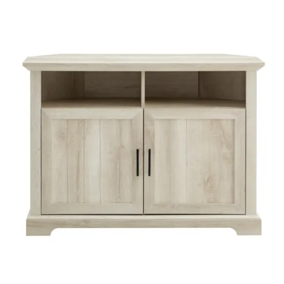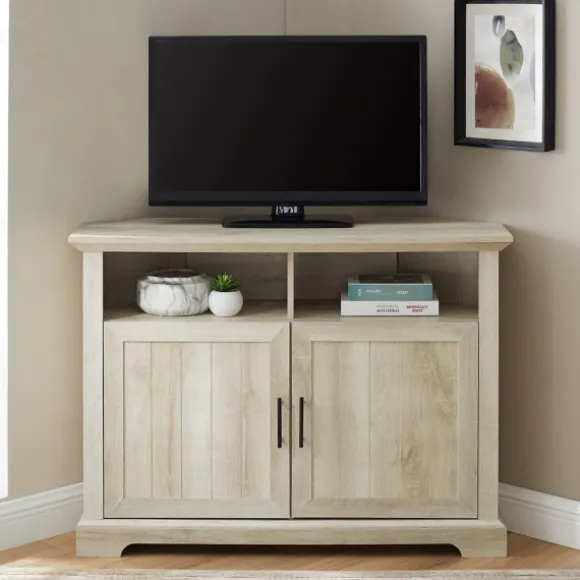 Our White Oak Grooved Door Corner Tv Stand Gives You That Extra Storage Space Your Living Room Needs. The Corner Shape Fits Nicely In Any Space And The Grooved Wooden Doors Reveal Extra Shelf Space. Stand Measures 44L X 15.75W X 32H In. Crafted Of Warp-Resistant Wood Composite, Durable Laminate, And Powder-Coated Metal Whitewashed Finish Space-Saving Corner Design Features Two (2) Cubbies And Two (2) Doors Doors Open To Reveal Three (3) Adjustable Shelves Slatted Wooden Door Design Black Metal Hardware Weight Capacity: 250 Lbs. Fits Tv Sizes Up To 50 In.Full Assembly Required Not Intended For Commercial Use Care: Dust With A Soft, Dry Cloth.This Item Is Available At Kirklands.Com Only, Not Available In Stores. Please Note: This Item Cannot Be Shipped To Apo/Fpo Addresses.