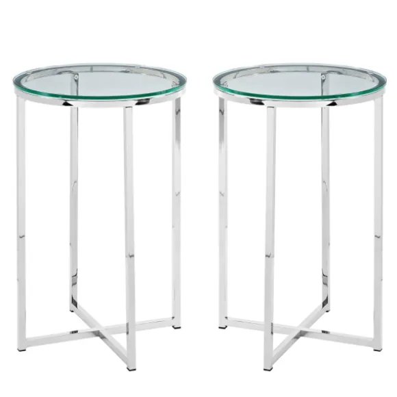 Style This Set Of Silver Metal And Glass Accent Tables Beside Your Sofa Or In Different Corners Of Your Living Room! With Their Sleek, Lustrous Finish And X-Base, They Have A Modern-Chic Look That You’Ll Love. Set Includes Two (2) Accent Tableseach Table Measures 24H X 16 In. In Diametercrafted Of Tempered Glass, Powder Coated Steel, Wood Composite, And Laminatesilver Metal Base Finishclear Glass Tabletop Finishx-Baseround Shapeweight Capacity: 50 Lbs.Assembly Requirednot Intended For Commercial Usecare: Dust With A Soft, Dry Cloth.This Item Is Available At Kirklands.Com Only, Not Available In Stores. Please Note: This Item Cannot Be Shipped To Apo/Fpo Addresses.