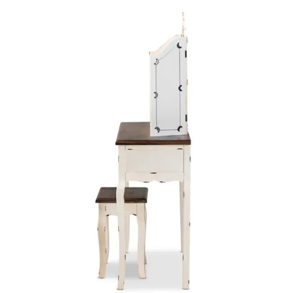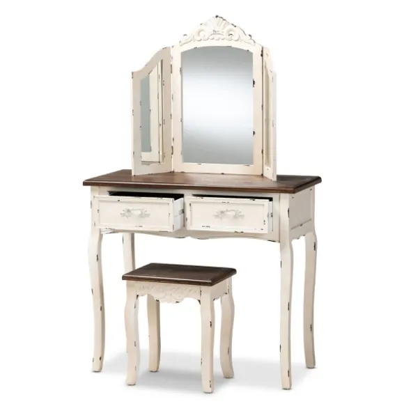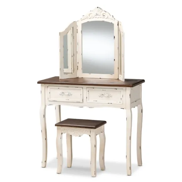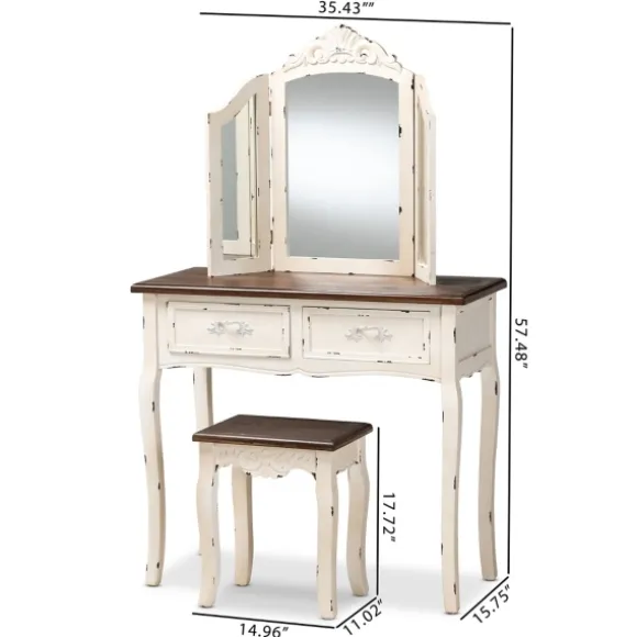 Get Ready In Style With This Antique White And Walnut 2-Pc. Vanity Set. Its Distressed Finish And Floral Molding Details Give It A Charming Vintage Look! Set Includes One (1) Vanity Table And One (1) Stooltable Measures 35.43L X 15.75W X 57.48H In.Stool Measures 14.96L X 11.02W X 17.72H In.Crafted Of Woodantique White Finishwalnut Top Finishtable Features Two (2) Drawers And A 3-Panel Mirrorcabriole Legsfeatures Floral Moldingassembly Required/Some Assembly Requirednot Intended For Commercial Usecare: Dust With A Soft, Dry Cloth.This Item Is Available At Kirklands.Com Only, Not Available In Stores. Please Note: This Item Cannot Be Shipped To Apo/Fpo Addresses.