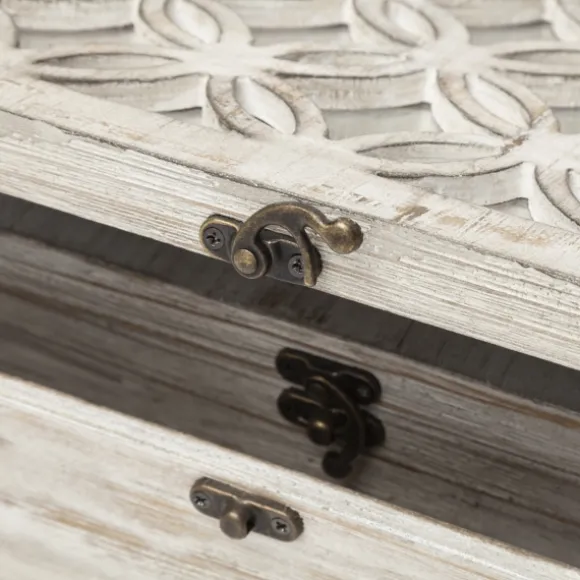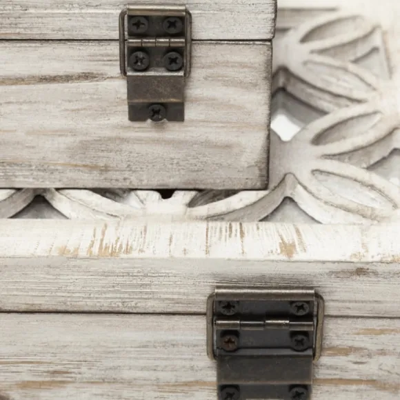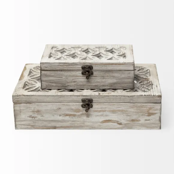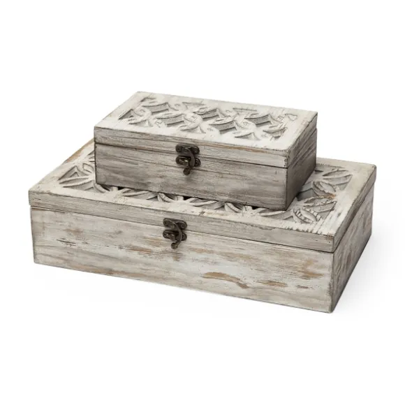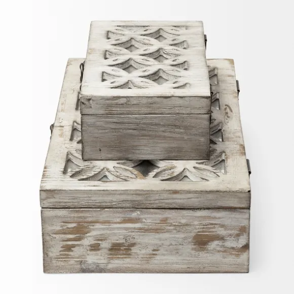 These Whitewashed Wooden Boxes Are A Wonderful Way To Store Jewelry Or Trinkets. You’Ll Love Their Beautiful Design And Charming Mirrored Details. Set Includes Two (2) Boxeslarge Box Measures 14L X 8W X 4H In.Small Box Measures 9L X 5W X 3H In.Crafted Of Woodrectangular Shapewhitewashed Finish Hues Of Tan And Whitefeatures Mirror Inlayfor Decorative Use Onlycare: Dust With A Soft, Dry Cloth.This Item Is Available At Kirklands.Com Only, Not Available In Stores. Please Note: This Item Cannot Be Shipped To Apo/Fpo Addresses.