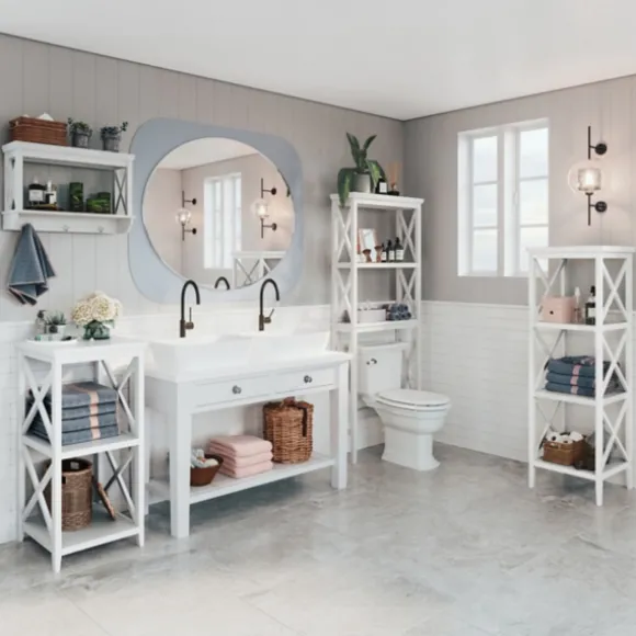 Organize All Your Towels And Toiletries With The Modern Style Of This White Wood 2-Tier Storage Shelf. You’Ll Love The R…