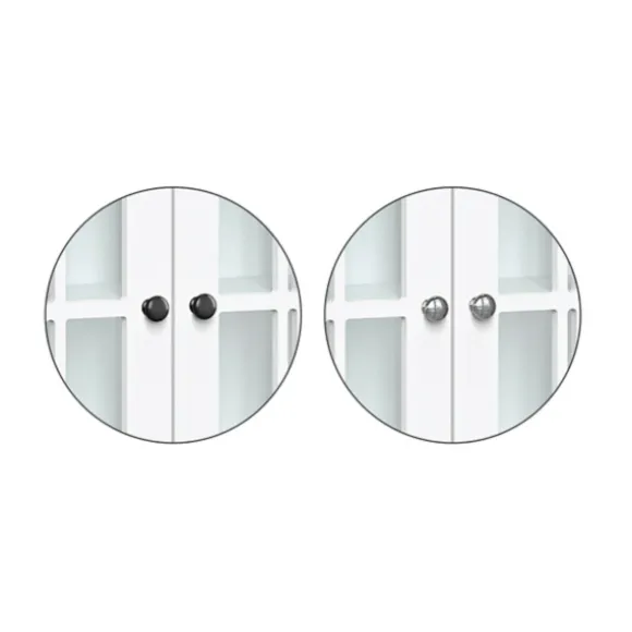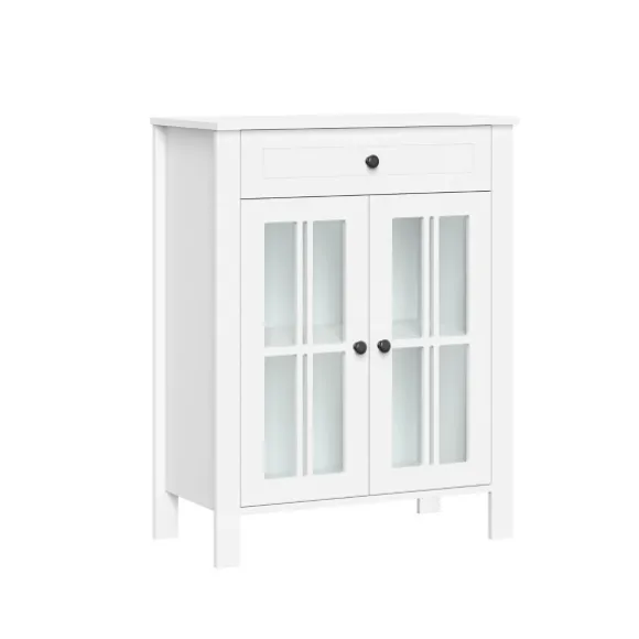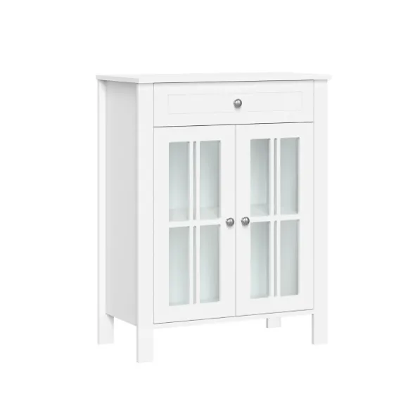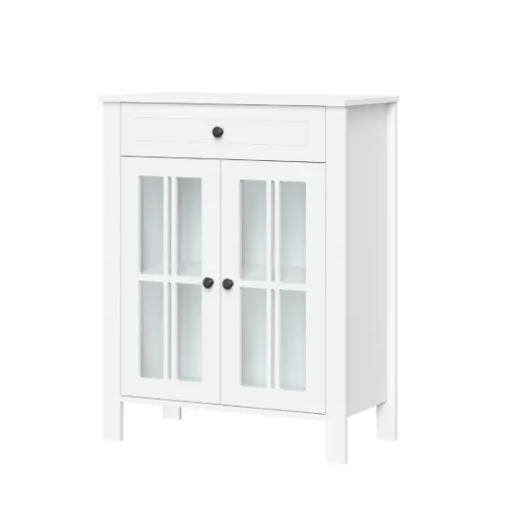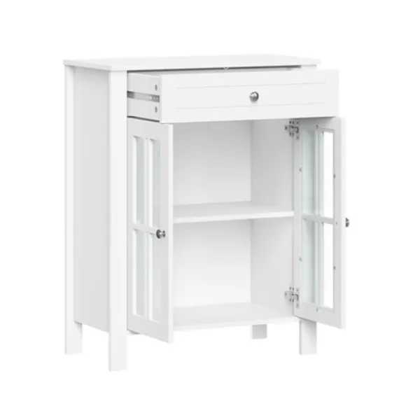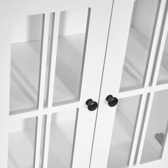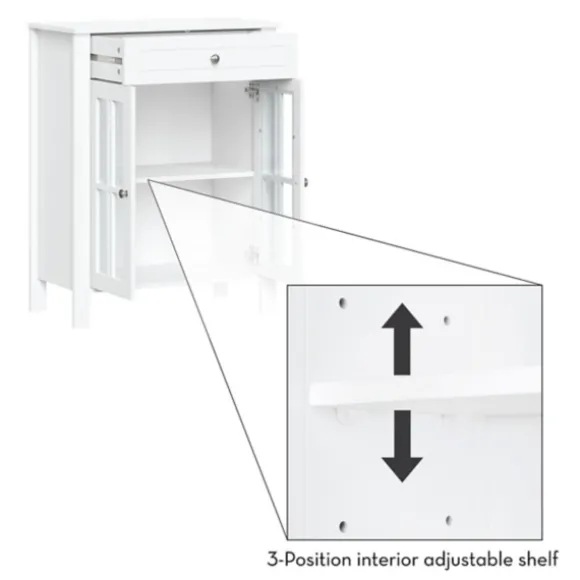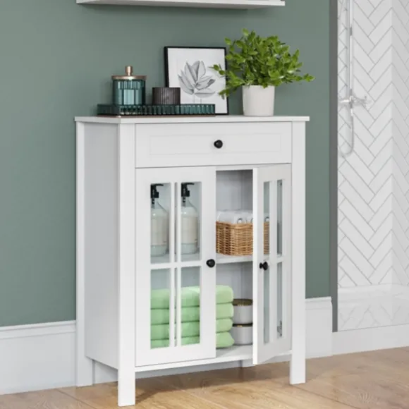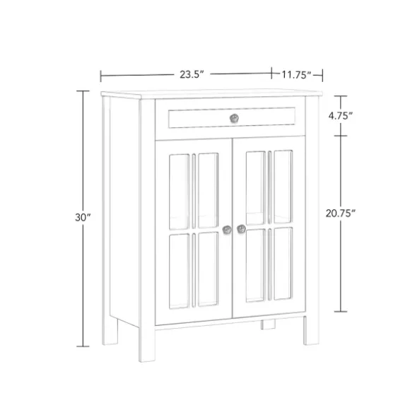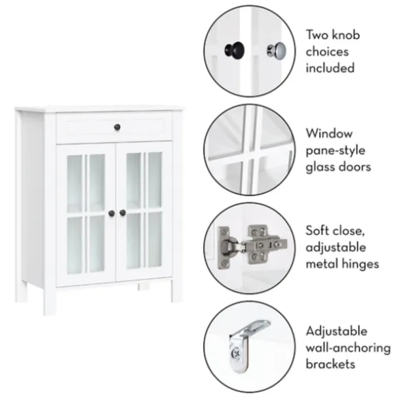 Stylish, Versatile And Full Of Space, Our White Wood Two Pane Glass Doors Floor Cabinet Belongs In Your Master Bathroom! Fill The Inside Shelves With Cleaners And Linens And Decorate The Top Shelf With Plants And Lotions! Cabinet Measures 23.5L X 11.75W X 30H In.Crafted Of Wood And Glasswhite Wood Finishfeatures Two Windowpane Glass Doorssoft-Close Hinge Allows Quiet Closingincludes Your Choice Of Silver Or Black Knobsincludes Two (2) Fixed Interior Shelves, One (1) Open Top Shelf, And One (1) Drawersecures To The Wall With An Adjustable Anchor Bracket For Added Stabilityweight Capacity: 10 Lbs. Per Shelfassembly Requirednot Intended For Commercial Usecare: Dust With A Soft, Dry Cloth.This Item Is Available At Kirklands.Com Only, Not Available In Stores. Please Note: This Item Cannot Be Shipped To Apo/Fpo Addresses.Warning:This Product Can Expose You To Chemicals Including Formaldehyde Which Is Known To The State Of California To Cause Cancer And Birth Defects Or Other Reproductive Harm.For More Information Go Towww.P65Warnings.Ca.Gov .