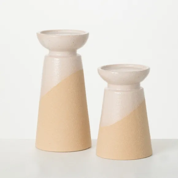 Add A Modern Accent To Your Mantel Or Shelf With These Two-Toned Cream Pillar Candle Holders. Their Hand-Thrown Design And Neutral Hues Give Them An Earthy Charm! Set Includes Two (2) Vaseslarge Vase Measures 8.5H X 4.25 In. In Diametersmall Vase Measures 6.25H X 4 In. In Diametercrafted Of Ceramic Tapered Cylinder Shapetwo-Toned Designhues Of Cream And Tanhand Thrownfor Decorative Use Onlycare: Dust With A Soft, Dry Cloth.This Item Is Available At Kirklands.Com Only, Not Available In Stores. Please Note: This Item Cannot Be Shipped To Apo/Fpo Addresses.