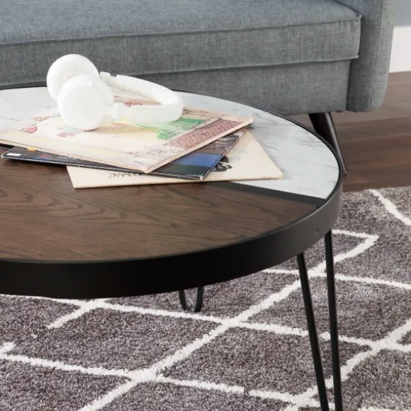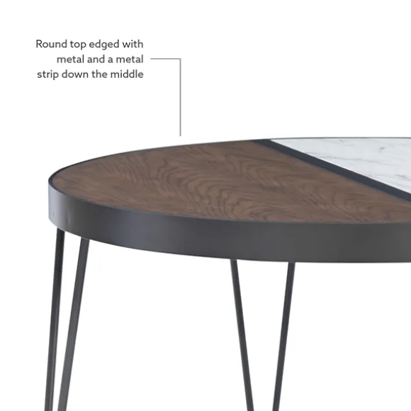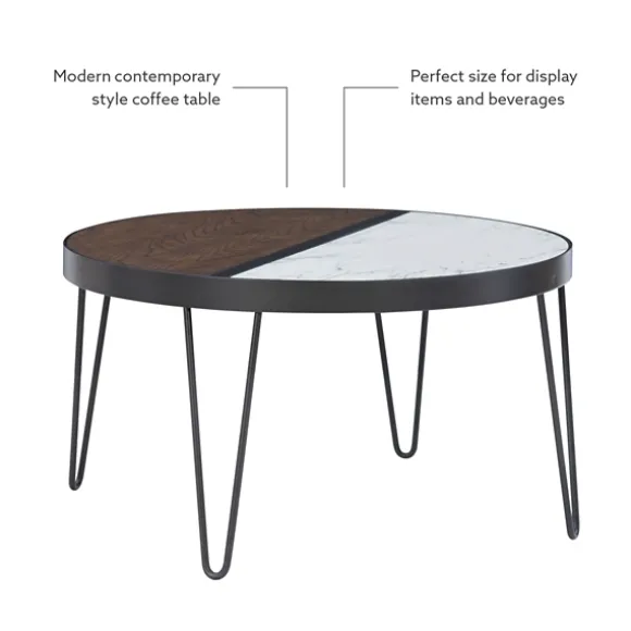 The Round Brown Wood And White Marble Top Coffee Table Will Perfectly Blend With Your Modern Or Contemporary Decor. With Its Two Tone Finish And Metal Hairpin Legs, It Exudes Chic Character! Table Measures 18H X 32 In. In Diametercrafted Of Metal, Wood, And Paper Veneerfaux Marble And Wood Top Finish With Metal Stripmetal Hairpin Legsround Shapeweight Capacity: 100 Lbs.Assembly Requirednot Intended For Commercial Usecare: Dust With A Soft, Dry Cloth.This Item Is Available At Kirklands.Com Only, Not Available In Stores. Please Note: This Item Cannot Be Shipped To Apo/Fpo Addresses.Warning:This Product Can Expose You To Chemicals Including Dehp Which Is Known To The State Of California To Cause Cancer And Birth Defects Or Other Reproductive Harm.For More Information Go Towww.P65Warnings.Ca.Gov .