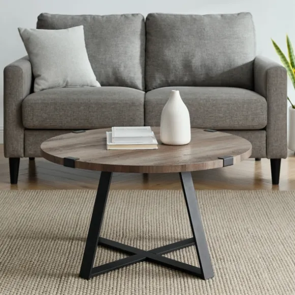 Make An Arrangement Of Books, Flowers, And Candles On Top Of This Gray Urban Rustic Round Coffee Table. Even The Top Of The Table Has Metal Accents That Create The Perfect Industrial Look For Your Space!Accent Table Measures 17H X 31 In. In Diameter Crafted Of Laminate And Metal Gray Wash Table Top Finish Black Base Finish Round Shape Natural, Wood Grain Details Durable, Laminate Table Top Four (4) Metal Legs Form The Cross Base Design Metal Legs Wrap Around Table Top Full Assembly Required Not Intended For Commercial Use Care: Dust With A Soft, Dry Cloth.This Item Is Available At Kirklands.Com Only, Not Available In Stores. Please Note: This Item Cannot Be Shipped To Apo/Fpo Addresses.