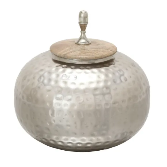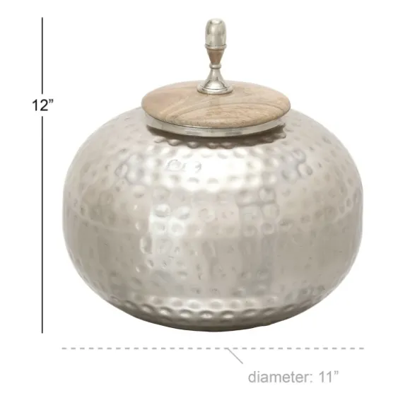 Stylish And Functional, This Round Silver Jar With Mango Wood Lid Is The Perfect Accent Piece For Your Home. You’Ll Love How Its Contrasting Materials Complement Each Other. Jar Measures 12H X 11 In. In Diametercrafted Of Iron, Aluminum, And Mango Wood Silver Finishmetallic, Textured Designround Shapewood Lid Features Metal Knob Finialfor Decorative Use Onlycare: Dust With A Soft, Dry Cloth.This Item Is Available At Kirklands.Com Only, Not Available In Stores. Please Note: This Item Cannot Be Shipped To Apo/Fpo Addresses.